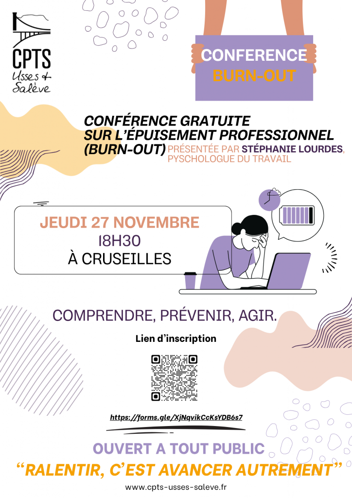 Notre CPTS, déjà impliquée dans la prise en charge et la prévention du burn-out, vous propose une conférence tout public, présentée par Mme LOURDES Stéphanie, psychologue du travail.